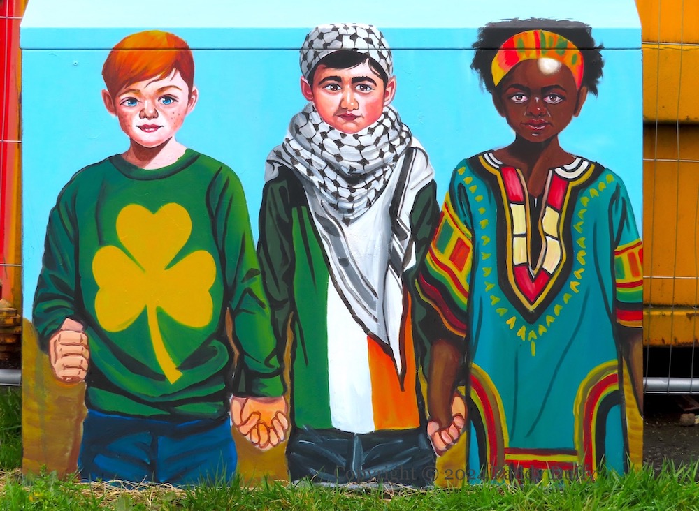 The support for Palestine by Ireland and South Africa is illustrated here by Irish, Palestinian, and South African children standing hand-in-hand. The same type of image was also used, with younger children, in the Painting For Palestine project on the International Wall – see The International Court Of Justice, which also gives details of South Africa’s initial case against Israel.