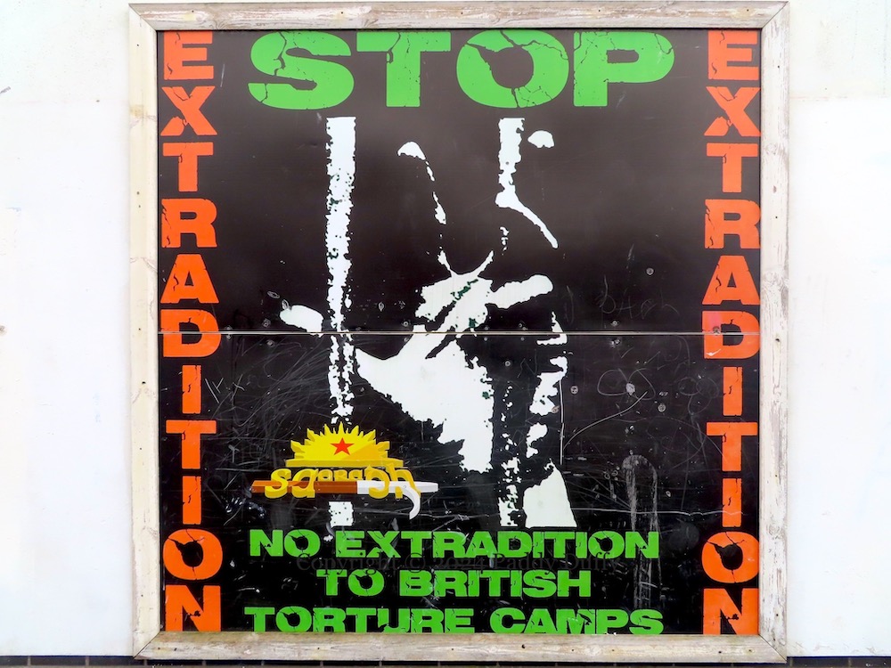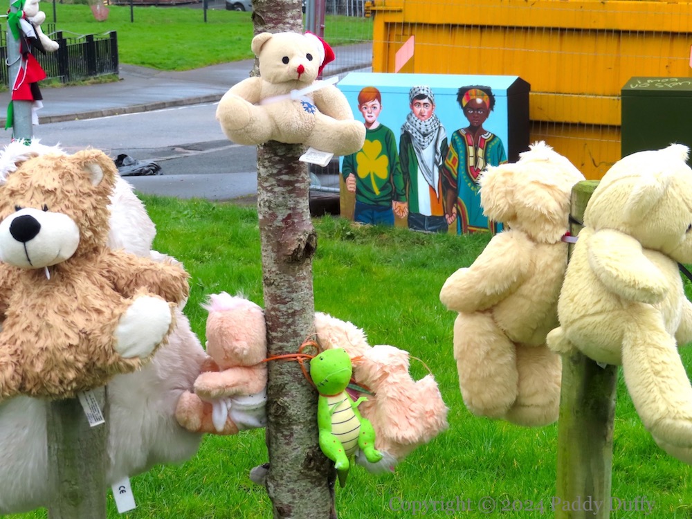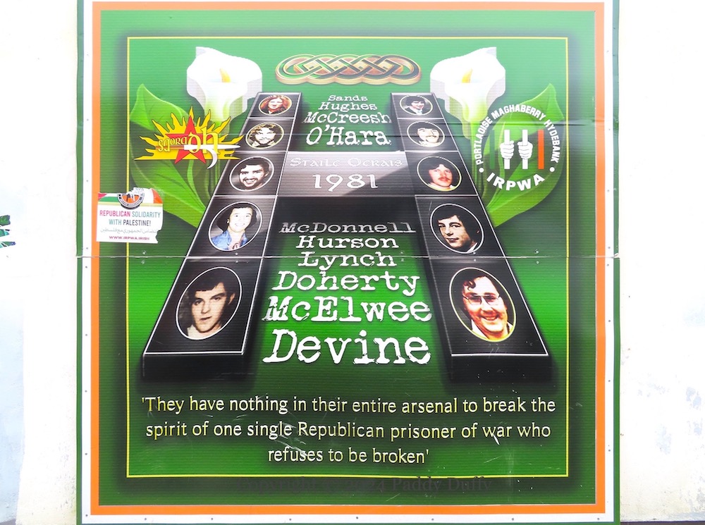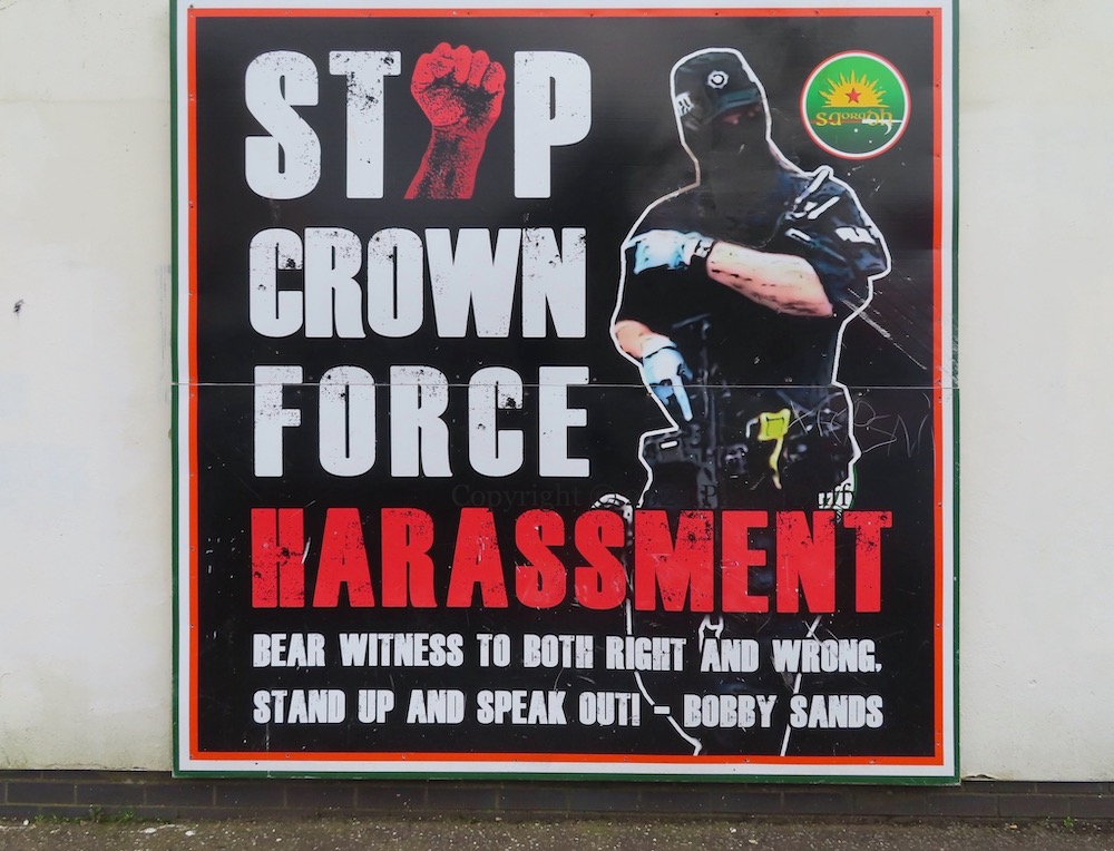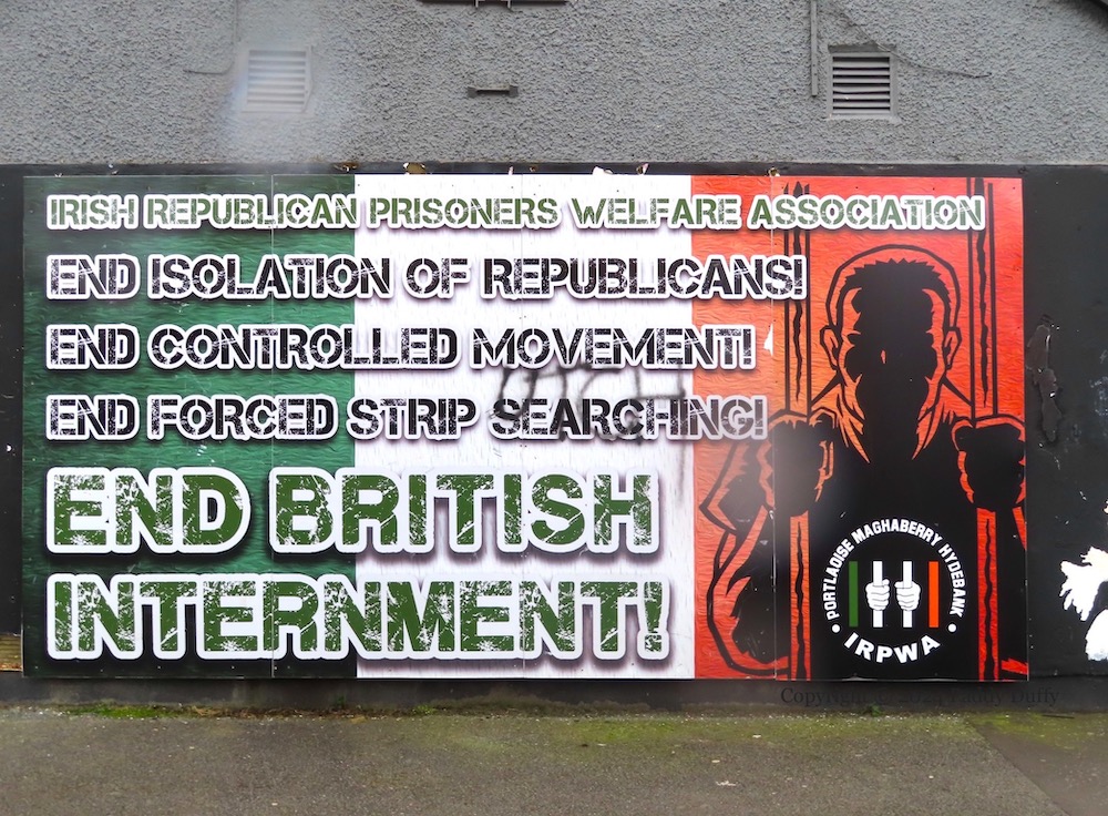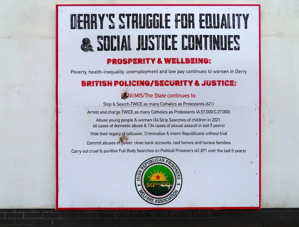 Here is a survey of the republican boards along Central Drive, Creggan. Above, “Victory to Hamas” graffiti has been added to emic’s Younger Days street art. The piece immediately below was seen in Victory To The PFLP, and the anti-extradition piece was seen previously in the 2022 post covering Central Drive. The other pieces – “Stop crown force harassment”, the 1981 hunger strike board, the “struggle for equality and social justice” board, and the IRPWA board, are all new.