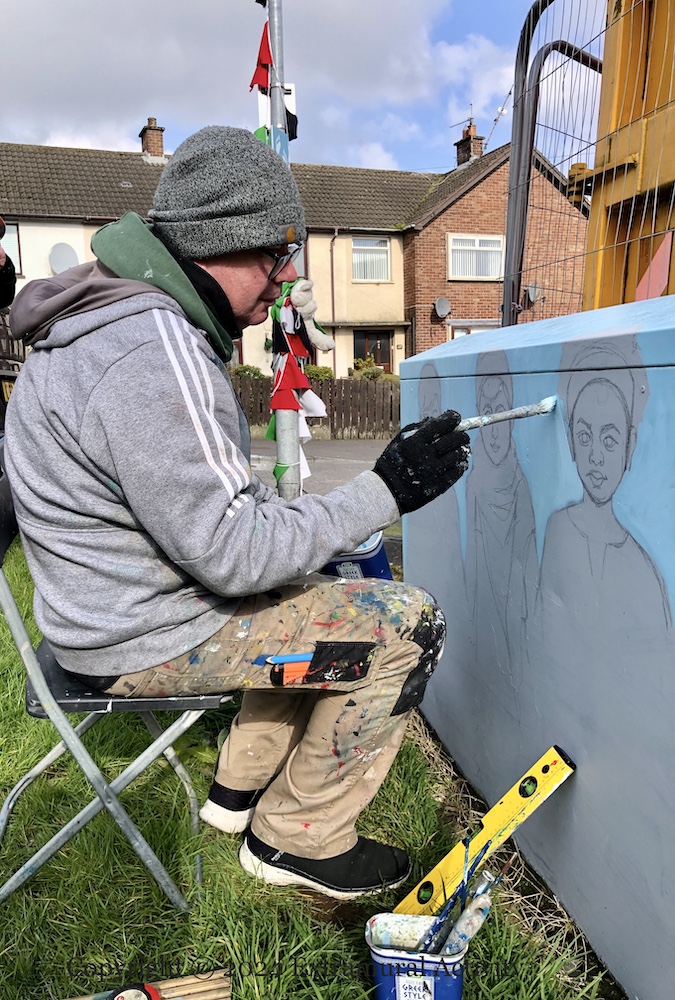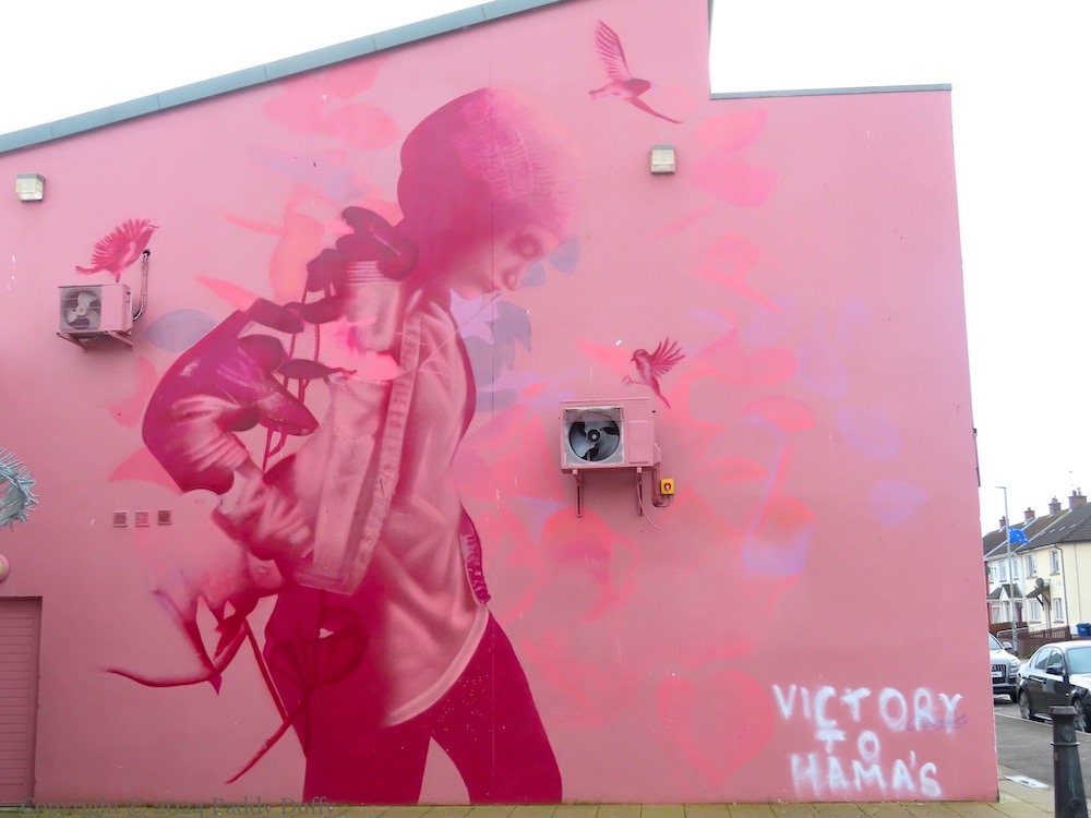 Here is a gallery of images from the lane leading to the houses from behind the Creggan shops, with a mixture of the old (anti-drugs) and new (flowers) pieces.