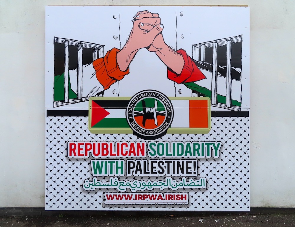 Two murals have been added to the exterior of Felons’ Club in Andersonstown to show support for Palestine. Above, on the Lake Glen side of the club, a printed board reading “We stand with Palestine – seas leis an Phalaıstín” and including an Emmalene Blake image (ig) on the right (shown in close-up, below); further below, a “Stop the genocide in Gaza” tarp above the entrance.