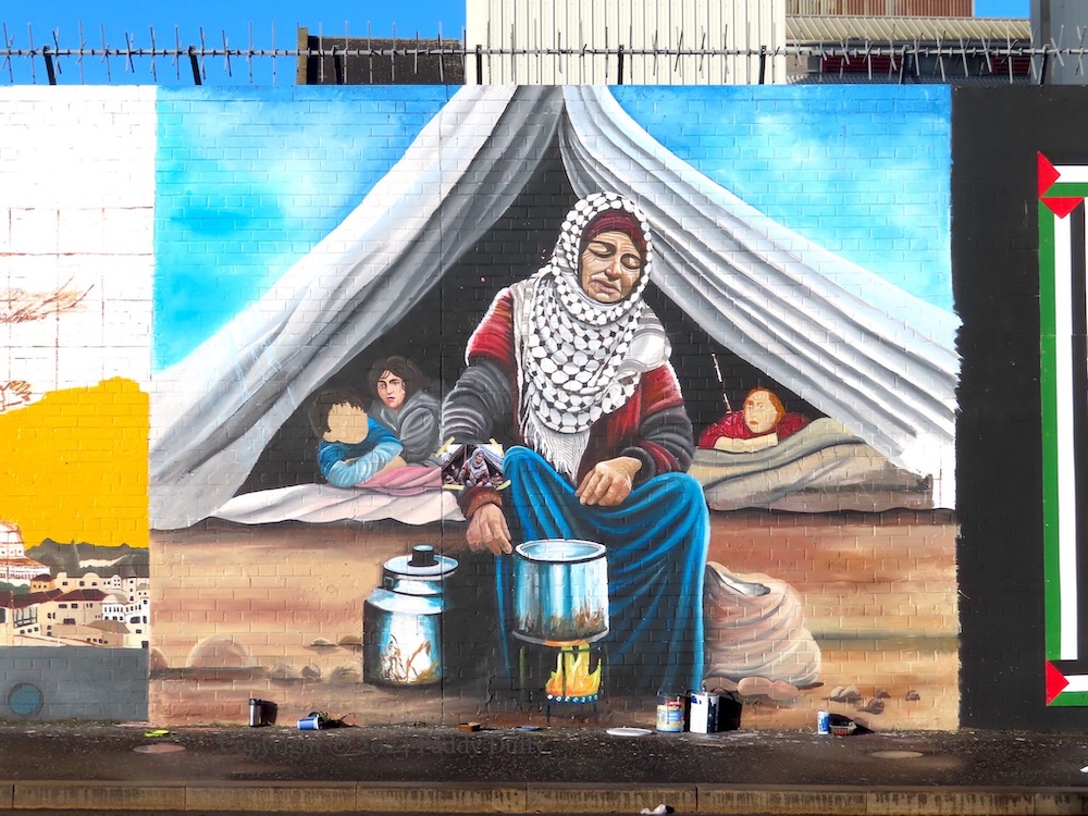 The mural is on the International Wall, west Belfast, part of the Painting For Palestine project (Fb). The original artist is unknown.