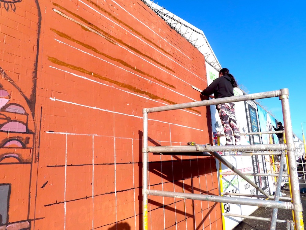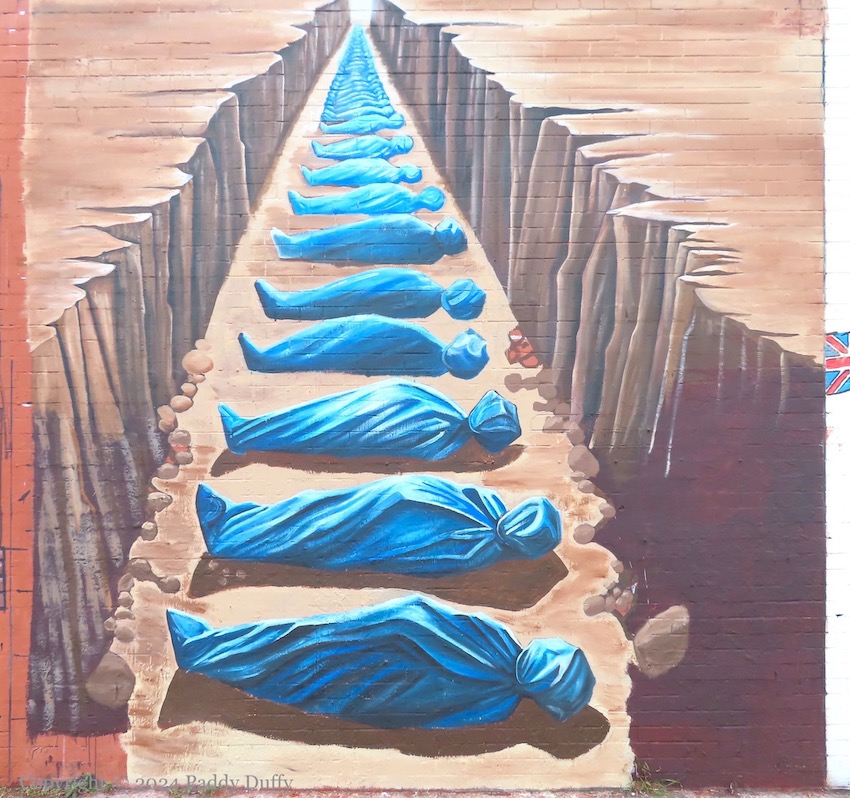 This entry chronicles (in reverse order/from latest to earliest) the painting of one of Saïd Hassan’s (ig) contributions to the Painting For Palestine (Fb) project that is currently transforming the International Wall on Divis Street in west Belfast. The piece appears to be inspired by the mass grave in Khan Younis (in the Gaza Strip) in which more than 100 corpses were buried in November (Al Jazeera video | Reuters gallery).