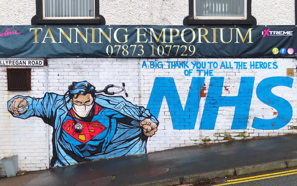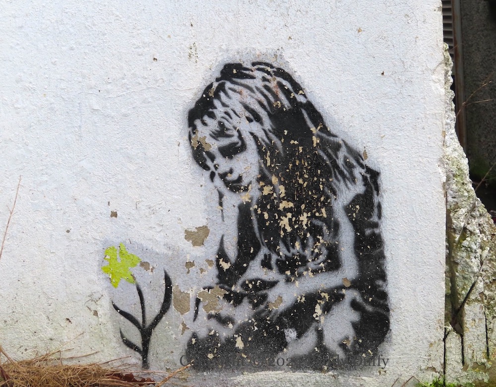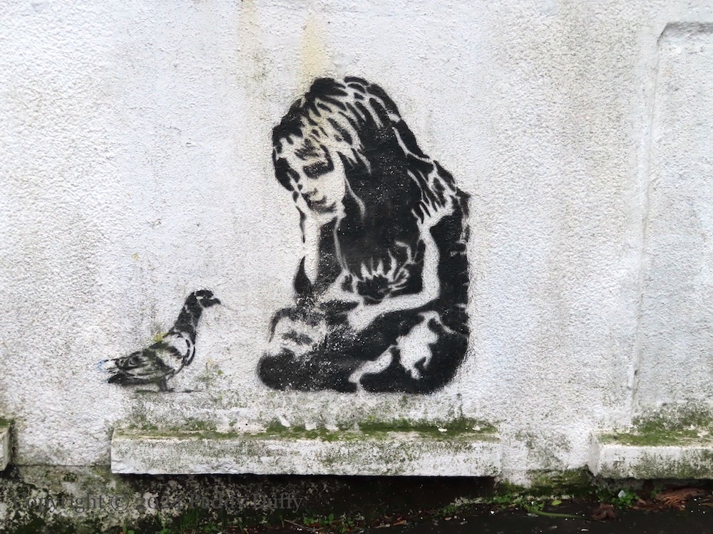 Here are some older pieces still rolling in Dundonald: Above, a pandemic-era mural with Superman as a doctor: “A big thank you to all the heroes of the NHS”; below, two small stencils of a young girl contemplating a pigeon and a flower.