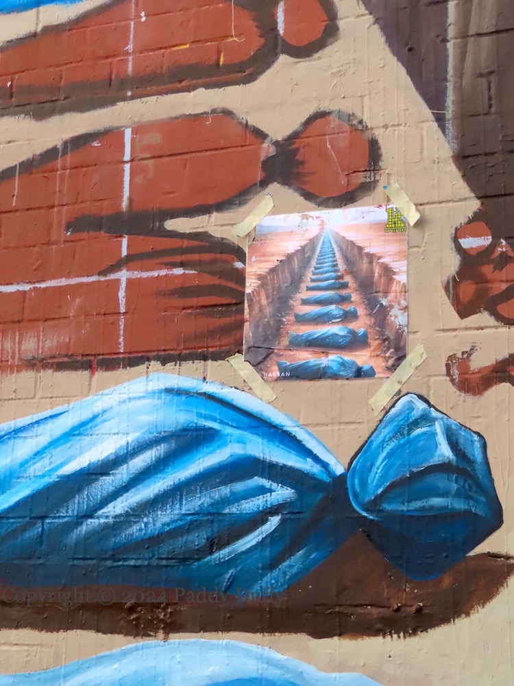 ‘Solidarity today, solidarity everyday [every day]”. International politics makes a rare appearance in the city centre: support for the Palesitinians in Gaza – now under attack from Israeli forces for 116 days (Al Jazeera) takes the place of pieces by Conor McClure and All The Doodz.