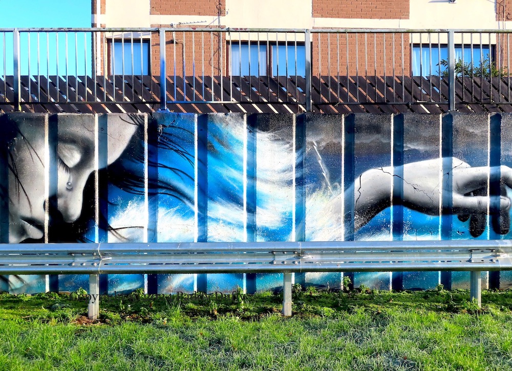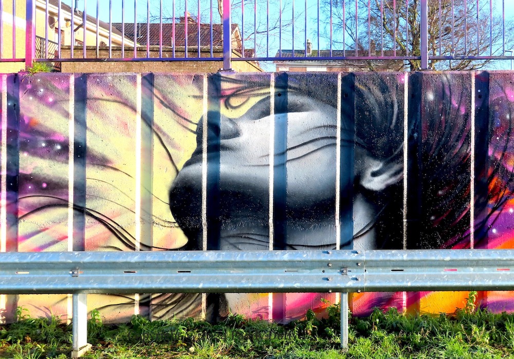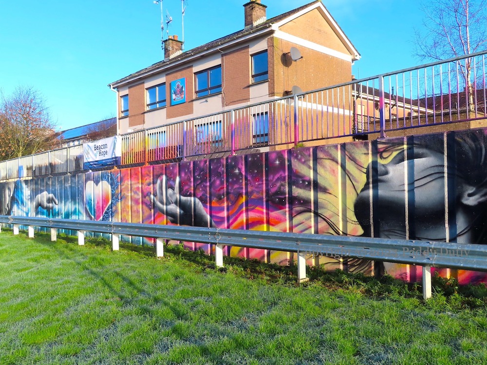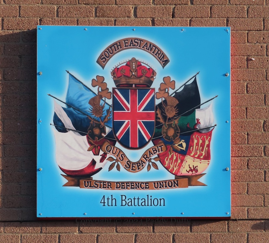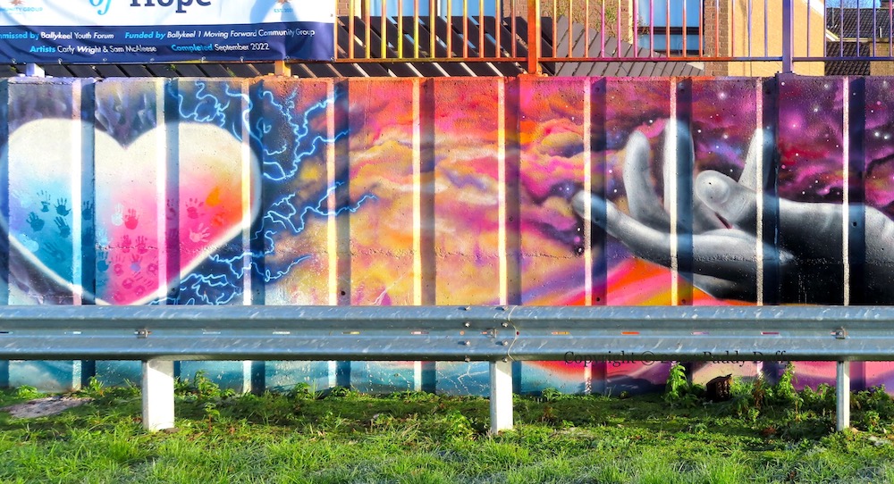 The new mural in Drumtara, Ballymena, was painted by Craig Gilmore, who also did the recent tribute to Elizabeth II (see The Crown) (Ballymena Guardian article on the mural, also by Blackadder). The cut-outs (in the third image) are on a wall at the bottom of the estate; the machine-gunner is unusual.