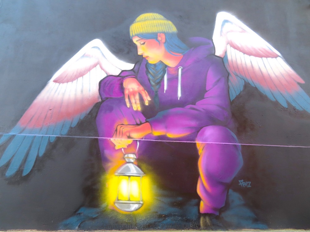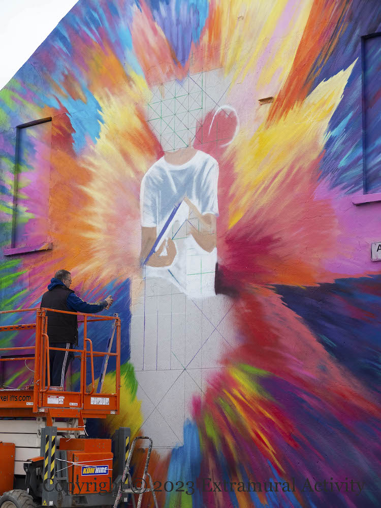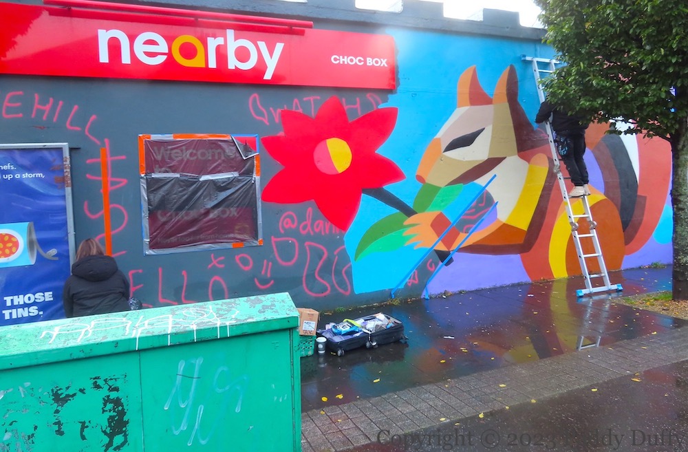 The mural is in Agnes Street, at the far end of Marine Highway, heading towards Eden. The in-progress images below show Glen at work and the mural at different stages of development.