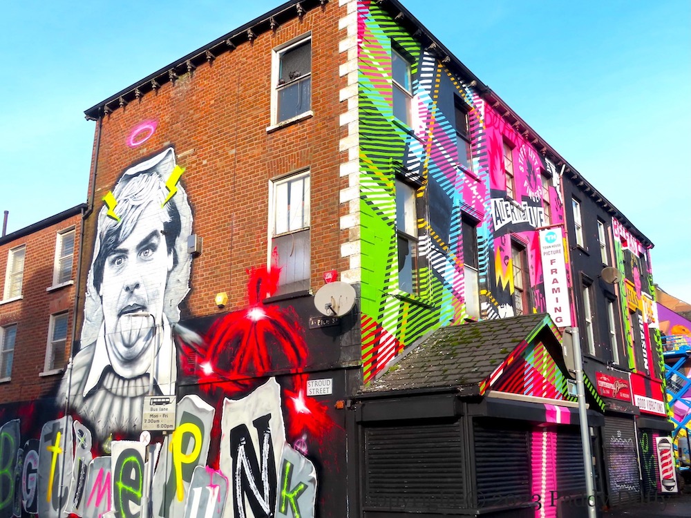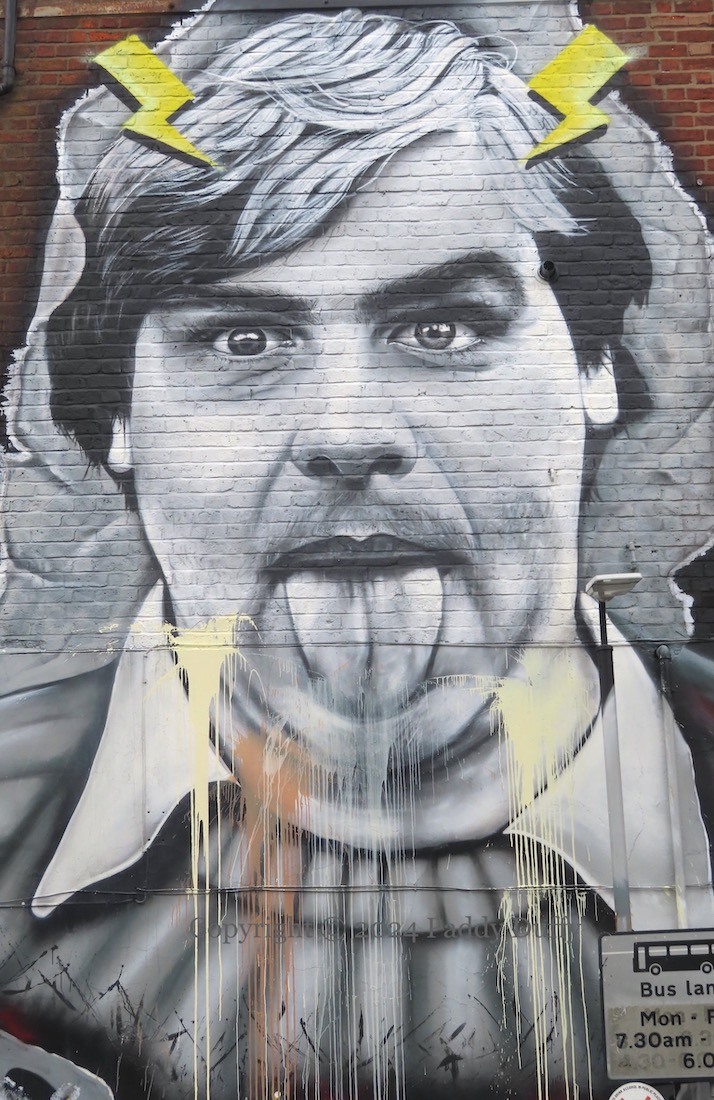 In order, from left to right/top to bottom in this post: in Stroud Street we have “Big-time punk” Terri Hooley by Peaball (RAZER (ig) and NOYS (ig)); on 127 Great Victoria Street we have tartan by Rob Hilken (ig), on 125, “Alternative Ulster” by Alana McDowell (ig) — for the ‘Alternative Ulster’ fanzine, see Fountain Street Spirits; on 123, designs by NotPop (ig); on 121, “Belfast Has The Reason” and “Good Vibrations” signage by Zippy (ig). With support from Linen Quarter BID (web), Belfast City Council (BCC press release) and Daisy Chain (web).