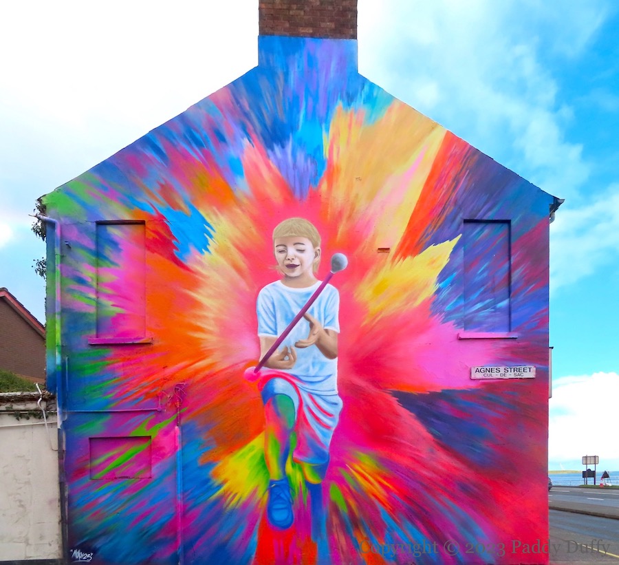 This is the new Glen Molloy mural in Carrickfergus, showing a boy practicing his baton-twirling and marching. It’s in the same style as the Little Drummer Boy in the Shankill.