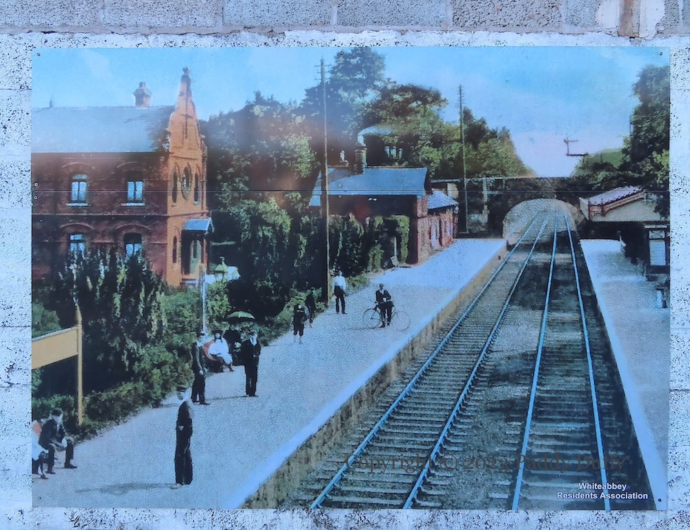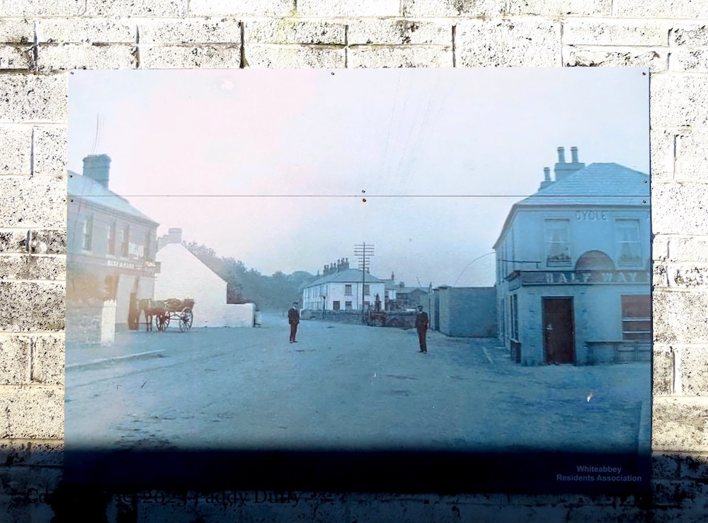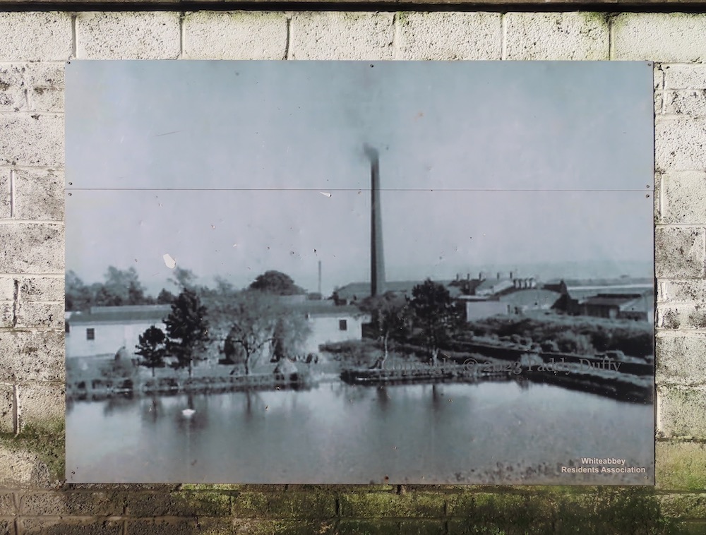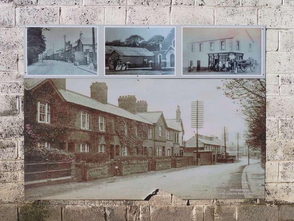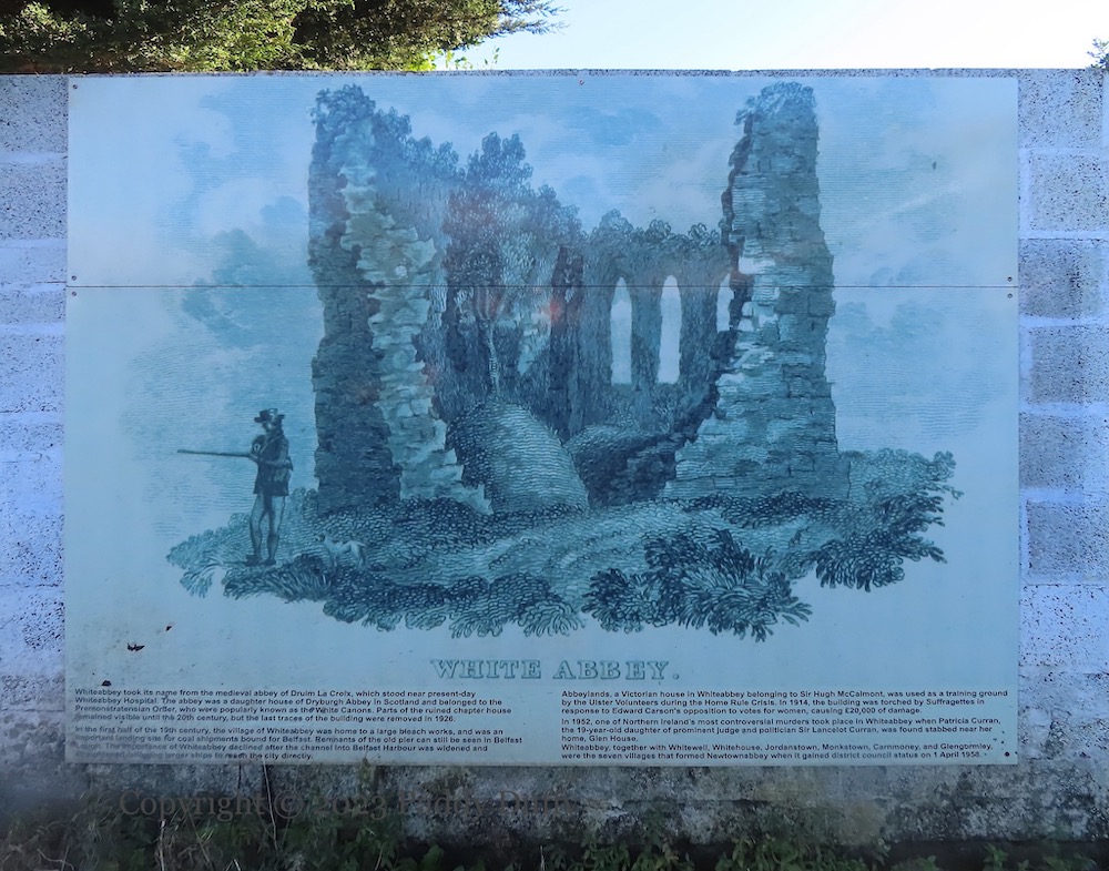 “Sometimes you will never know the value of a moment until it becomes a memory.” Work to clean up and beautify Devlin’s Lane in Whiteabbey began in 2020, with the large butterfly mural shown above (Belfast Live); 15 (16?) boards showing local history were put in place in August 2021 (NIWorld | Belfast Live). The text on the ‘White Abbey’ panel comes directly from WP.