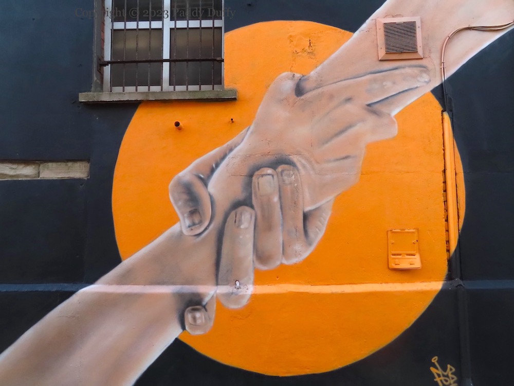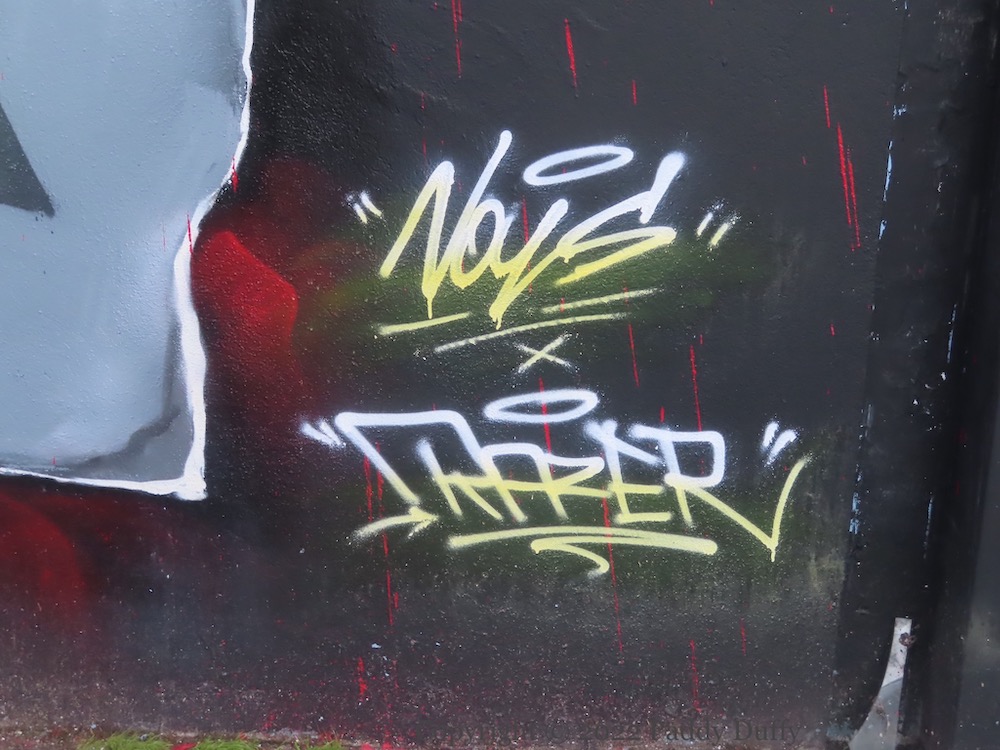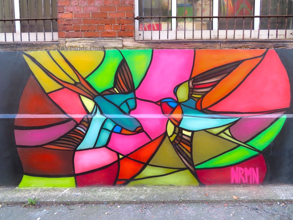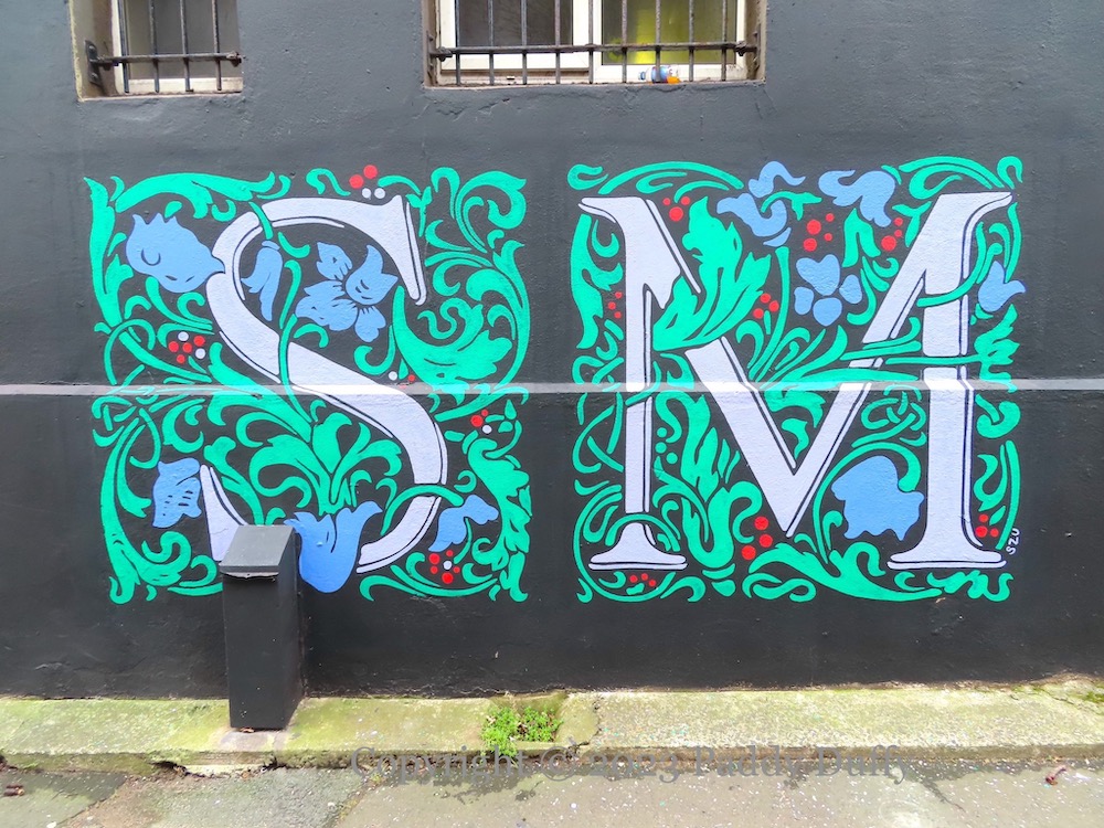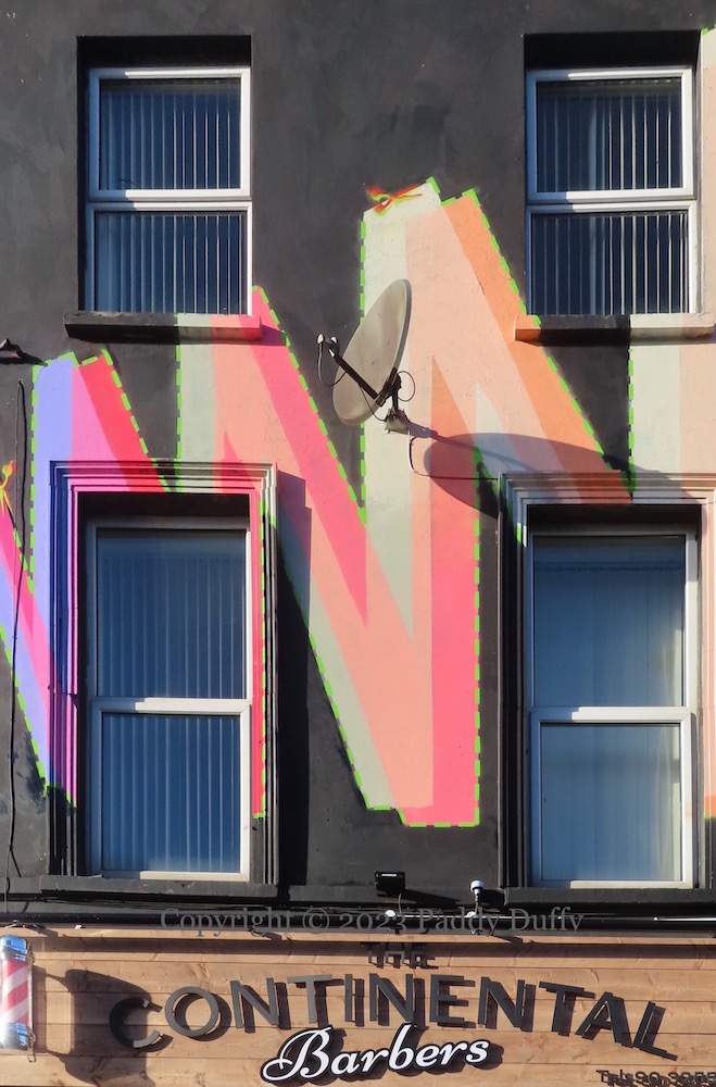 Work by FGB (ig), NRMN (ig), Friz (ig), and Laura Nelson/Szu Szu Signs (ig) join those by Rob Hilken, emic, and Kerrie Hanna (see Spells Joy) along the side of the Shankill Mission, new home of Vault Artist Studios (ig).