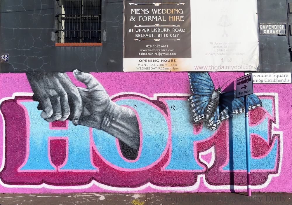 Also notable is that the board replaces a UDA mural – see Joint Manoeuvres. The other UDA mural in the estate — Carrickfergus Eddie — has also been replaced.