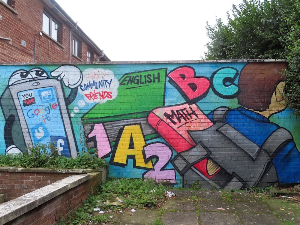 The Vault artists have moved out of the old Belfast Met building in east Belfast (see Do You Own A Giant Building? | The Vault Is Empty | Locked Vault) and set up shop in Marlborough House in the city centre and the Shankill Mission in west Belfast. The group have a new web site: vaultartiststudios.com. The inaugural event at “Marly” took place this weekend, called It’s All Your Vault. There will also be a launch event at the Shankill Mission at some point. In the meantime, here are three from the side of the Shankill Mission, from (bottom) emic (ig), (below) Rob Hilken (ig), and (above) Kerrie Hannah (ig) who takes her inspiration from stained glass windows in Townsend Presbyterian by Wilhelmina Geddes (see On The Other Side).