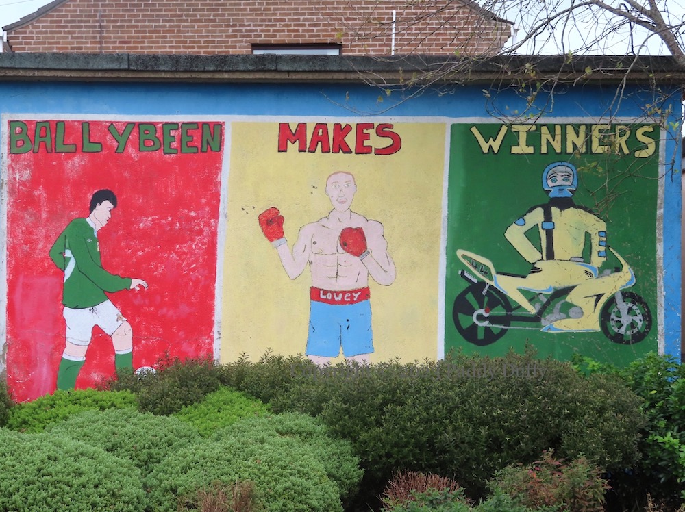 And further down Brooklands Drive, “Ballybeen makes winners” in sports: soccer, boxing, and motorcycle racing. The boxer is John Lowey, who represented Ireland at the 1988 Olympics; he is also featured in Boxing Through The Generations and Ballybeen Dream which last also includes three local footballers.