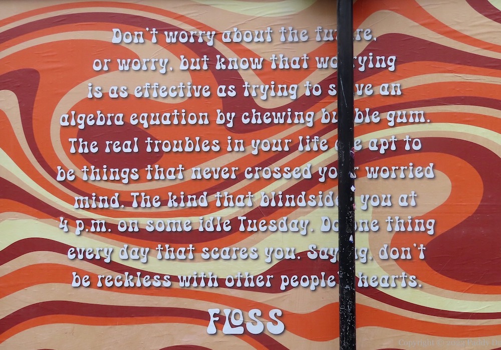 Don’t worry about the future,/or worry, but know that worrying/is as effective as trying to solve an/ algebra equation by chewing bubble gum./The real troubles in your life are apt to/be things that never crossed your worried/mind. The kind that blindsides you at/4 p.m. on some idle Tuesday. Do one thing/ every day that scares you./Saying, don’t be reckless with other people’s hearts/[Don’t put up with people who are reckless with yours] … Floss