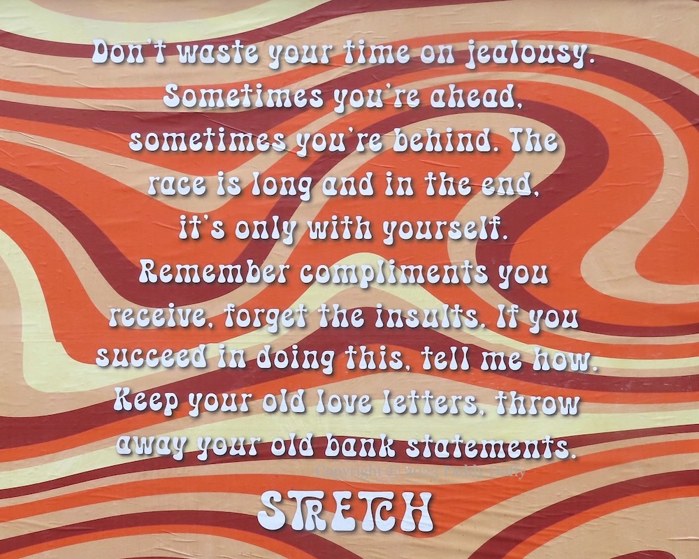 Don’t waste your time on jealousy./Sometimes you’re ahead,/sometimes you’re behind. The/race is long and in the end,/it’s only with yourself/Remember compliments you/receive, forget the insults. If you/succeed in doing this, tell me how./Keep your old love letters, throw/away your old bank statements … Stretch