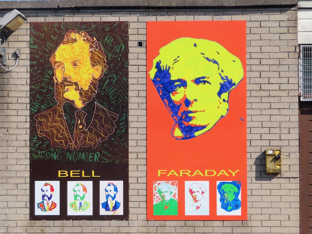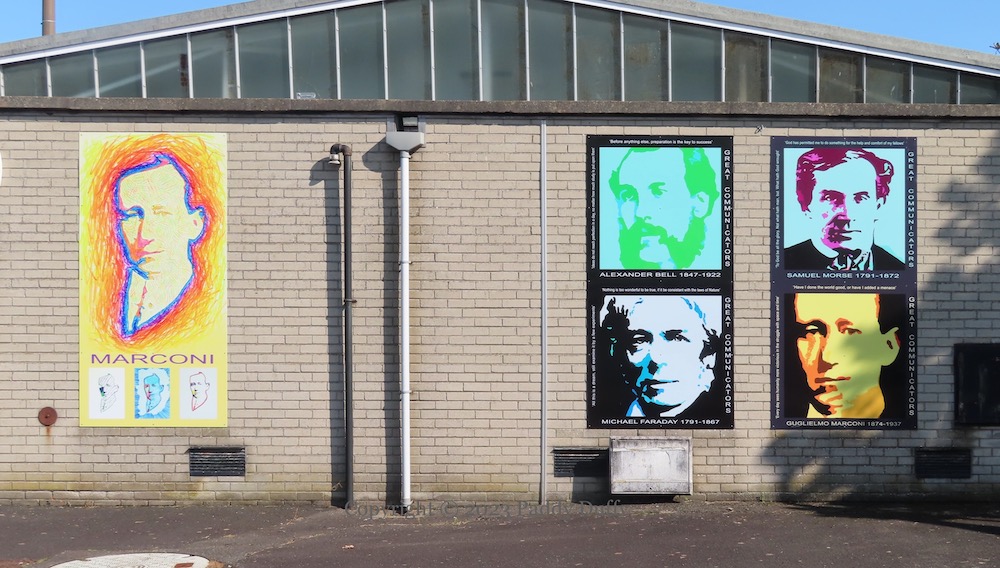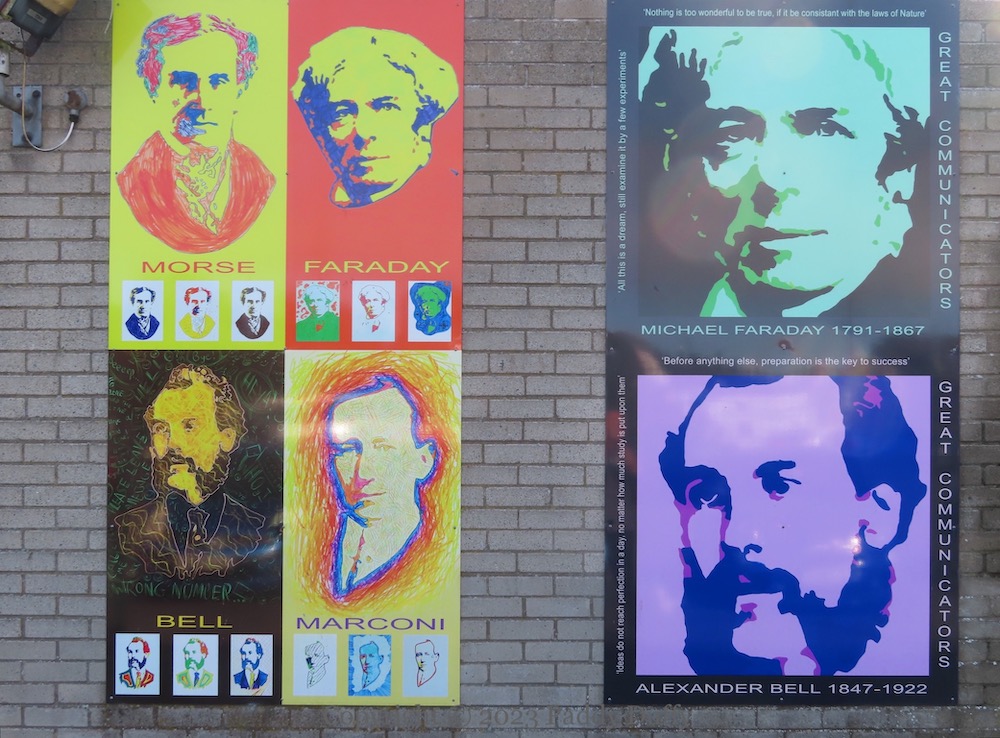 Local children painted portraits of four “Great Communicators” for the BT building at the corner of Main Street and Dundarave Road in Bushmills (NALIL). The set of less colourful boards, which also contain quotes, might be by adults.