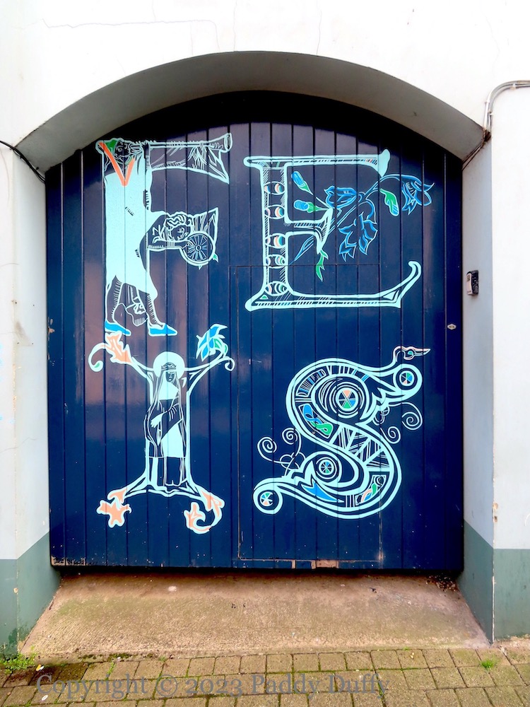The “F” makes reference to the local “Irish (Peasant) Home Industries“, while the “E” shows the harebell (bluebell) in flower. The “I” might be St Brigid as an oak or a reference to Princess Taisie/Taobhgheal of Rathlin.