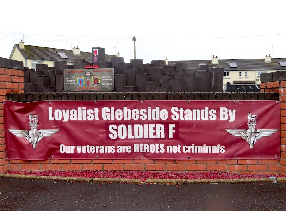 “Loyalist Glebeside Stands by Soldier F – Our veterans are HEROES not criminals.” Despite the support of Ballymoney loyalists, a court in Derry ruled in mid-December that Soldier F would stand trial on two murder charges and five attempted murders (BBC | BBC video), ahead of the forthcoming implementation of new legislation that would exempt former British Army personnel from prosecution (see Bill Of Shame).