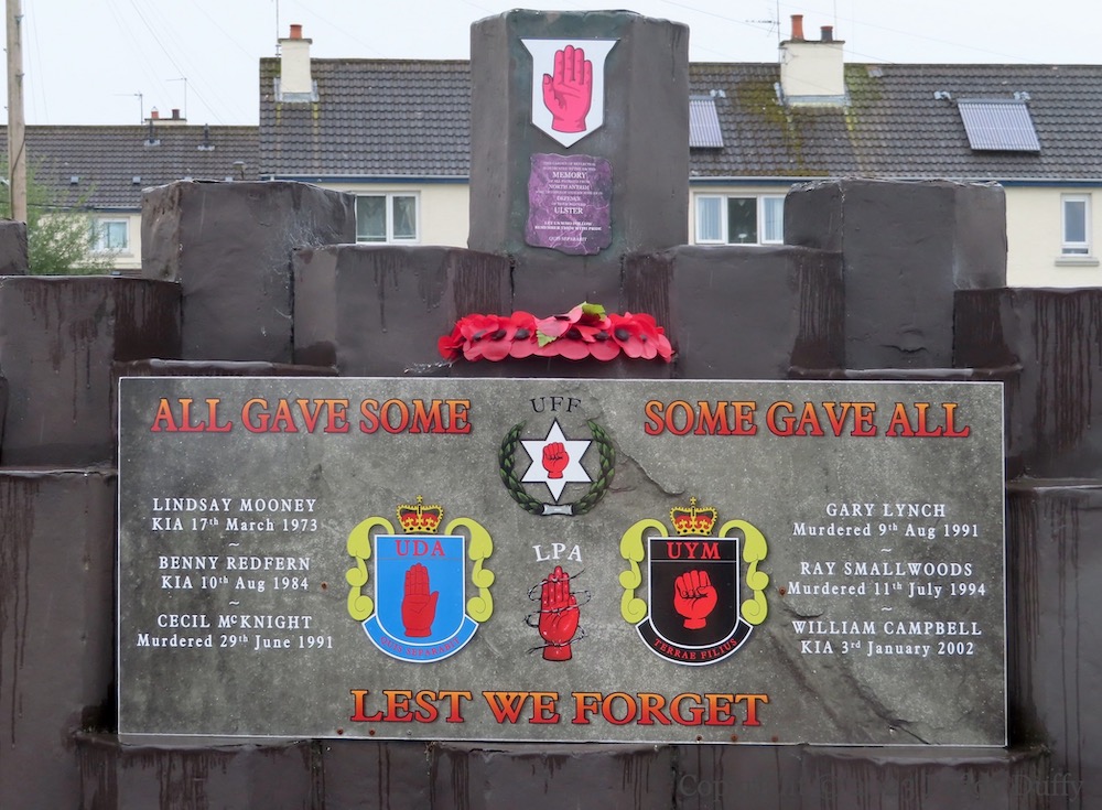 The tarp is next to the Causeway-style UDA memorial in Alexandra Avenue: “This garden of reflection is dedicated to the sacred memory of all patriots from North Antrim who in times of danger rose up in defence of their beloved Ulster – Let us who follow remember them with pride. Quis separabit. Lindsay Mooney, Benny Redfern, Cecil McKnight, Gary Lynch, Ray Smallwoods, William Campbell.”